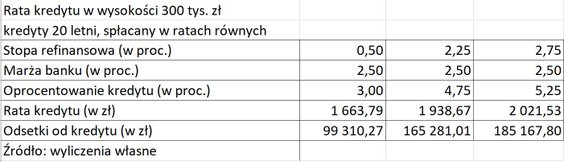 Do wyliczeń przyjęliśmy marżę banku na poziomie 2,5 pkt. proc. oraz założyliśmy, że stawka WIBOR jest równa stopie refinansowej NBP. W październiku 2021 r. stopa wynosiła 0,5 proc. - oprocentowanie kredytu wyniosło w sumie 3 proc. Rata 20-letniego kredytu w wysokości 300 tys. zł spłacanego w ratach równych, wynosiła wtedy 1 664 zł. Obecnie stopa refinansowa wynosi 2,75 proc. - rata kredytu wzrośnie o blisko 83 zł miesięcznie.