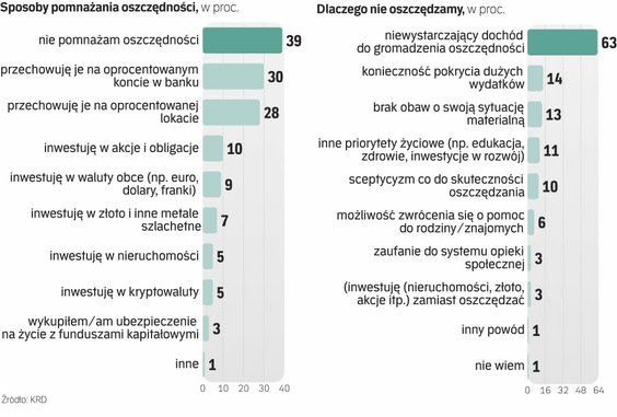 Najpopularniejszym sposobem pomnażania oszczędności jest przechowywanie ich na oprocentowanym koncie w banku. Robi tak niemal jedna trzecia badanych. Z kolei 28 proc. zakłada oprocentowane lokaty. Co dziesiąta osoba inwestuje w akcje i obligacje, 9 proc. badanych kupuje waluty, a 7 proc. złoto. Z kolei 5 proc. rodaków lokuje oszczędności w nieruchomościach i tyle samo w kryptowalutach.