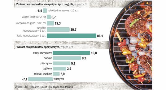 Ceny artykułów spożywczych na grilla są wyższe średnio o 3,9 proc. niż rok temu – wynika z badania UCE Research i agencji badawczej Hiper-com. To mocniej niż rynkowa średnia za marzec wynosząca 2,1 proc. i oficjalny wskaźnik inflacji konsumenckiej wynoszący 2 proc. Wygląda na to, że sieci handlowe chciały wykorzystać okazję i podniosły stawki najczęściej kupowanych z tej okazji produktów jeszcze mocniej niż reszty. Najbardziej, bo średnio o 10,8 proc. r./r., skoczyły ceny sosów, marynat i przypraw.