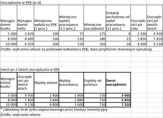 Pracownicze plany kapitałowe (PPK) to ogólnopolski program, który pozwala wszystkim zatrudnionym oszczędzać pieniądze z pensji z udziałem państwa i pracodawcy. Program zaczął być wdrażany od 1 lipca 2019 r. Do połowy 2021 r. PPK uruchomiły wszystkie firmy w Polsce. Zarabiając 5 tys. zł brutto, po 2 latach oszczędzania w PPK, można było odłożyć niemal 5 tys. zł, a w przypadku wynagrodzenia wynoszącego 8 tys. zł, kwota ta wyniosła około 7,5 tys. zł. Wyliczeniu uwzględnione zostały tylko wpłaty pracownika, pracodawcy i państwa, bez ewentualnych zysku z wypracowanych przez fundusz inwestycyjny.
