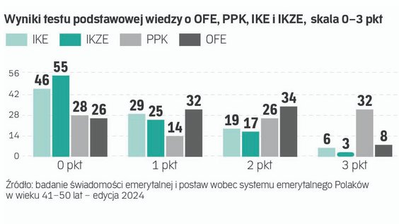 Poproszono uczestników badania o odpowiedzi na trzy pytania dotyczące każdej z metod oszczędzania długoterminowego. W ten sposób przeprowadzono test podstawowej wiedzy z zakresu IKE, IKZE, PPK i OFE. Każdy mógł uzyskać od 3 do 0 punktów. – Ponad połowa badanych (55 proc.) nie odpowiedziała poprawnie na żadne pytanie dotyczące IKZE, a 46 proc. nie znało poprawnej odpowiedzi na żadne z pytań o IKE. 2 lub 3 punkty o IKZE uzyskało 20 proc., a o IKE 25 proc. badanych – relacjonuje ekonomistka.