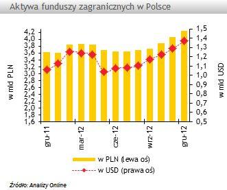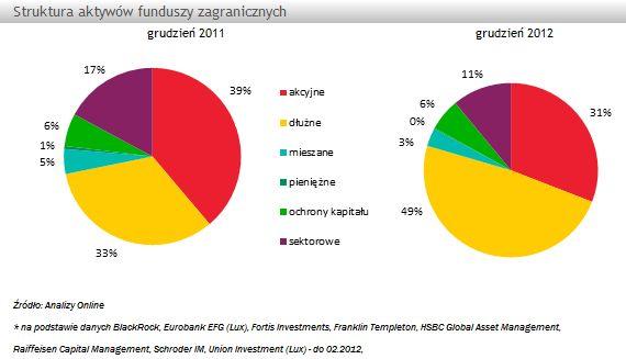 Pozostałe segmenty odnotowały spadek wartości zarządzanych środków. Aktywa zgromadzone w funduszach akcyjnych skurczyły się o 94 mln zł (-6,7 proc.), głównie w inwestujących w Ameryce Łacińskiej (-52 mln zł) oraz na rynkach rozwiniętych (-31 mln zł). Na koniec grudnia aktywa zgromadzone w funduszach akcyjnych warte były 1,3 mld zł, a ich udział w rynku spadł do 31 proc. Jeszcze większy spadek wartości zarządzanych środków dotknął segment funduszy sektorowych, o ponad -155 mln zł, do 465 mln zł. To wynik odpływu środków z kilku funduszy inwestujących na rynku surowców. Spadek aktywów odnotowały także najmniejsze segmenty rynku, czyli fundusze mieszane (o -22 mln zł do 142 mln zł) oraz pieniężne (o 13 mln zł do 8 mln zł).
