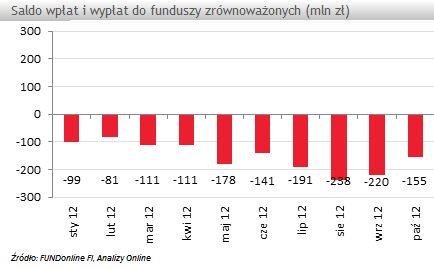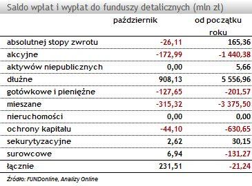 Od wielu miesięcy największą popularnością cieszą się fundusze dłużne. Podobnie było w październiku. Bilans sprzedaży dla tego segmentu wyniósł 0,9 mld zł. Ponad 60 proc. tej kwoty to środki wpłacone do 3 funduszy polskich papierów dłużnych, w tym najwyższe saldo wpłat i wypłat osiągnął PKO Papierów Dłużnych Plus (Parasolowy FIO), 0,3 mld zł. W przypadku 2 funduszy: UniWIBID oraz KBC Gamma SFIO, zdecydowanie przeważały odkupienia. Są to fundusze, które w październiku dokonały kolejnych przeszacowań obligacji PBG. Łącznie klienci wypłacili z tych funduszy 0,5 mld zł.