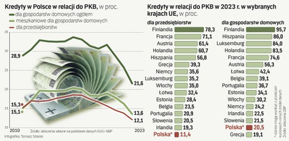 Takiej sytuacji nie było od co najmniej dekady. Wartość kredytów w relacji do wartości PKB we wszystkich kategoriach spada tak szybko, że w przypadku 2023 roku można wprost mówić o tąpnięciu.