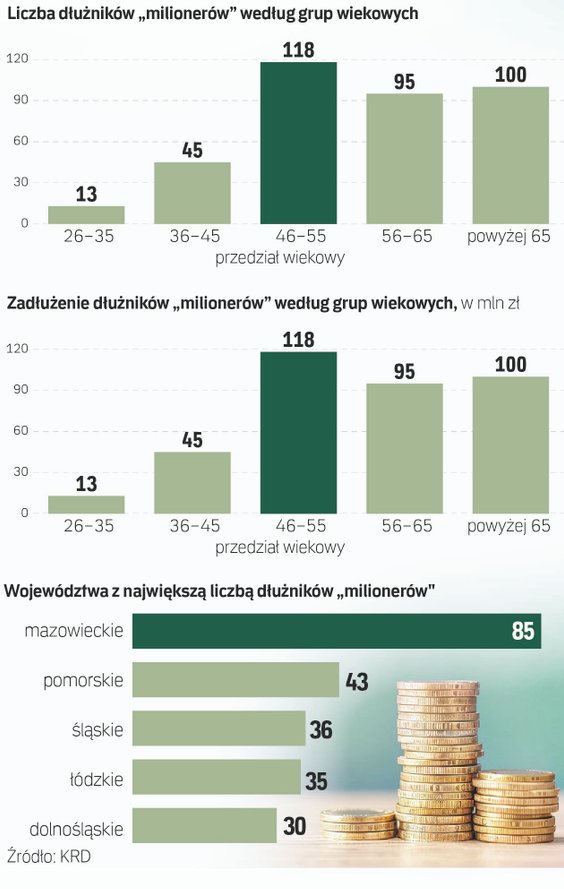 Z danych, do których dotarła „Rzeczpospolita”, wynika, że obecnie w Krajowym Rejestrze Długów Biurze Informacji Gospodarczej jest 371 konsumentów z niespłaconymi zobowiązaniami przekraczającymi milion złotych. Liczba dłużników „milionerów” nieznacznie przy tym spadła w ciągu ostatnich dwóch lat. W listopadzie 2022 r. było ich 373. Obecnie „milionerzy” zalegają wierzycielom 790 mln zł.