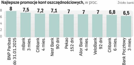 Ale nawet promocyjne oprocentowania zarówno lokat, jak i kont oszczędnościowych, są coraz niższe. Z lokatami jest nawet gorzej: obecnie najlepsza w promocji, sześciomiesięczna Nest Lokata Witaj dla klientów otwierających konto daje 7,1 proc. odsetek w skali roku. Nieco lepiej było z promocjami dla kont oszczędnościowych – jeszcze niedawno najlepszą ofertę miał mBank – oczywiście dla otwierających eKonto osobiste: Rachunek Moje cele z oprocentowaniem 7,5 proc. na trzy miesiące.