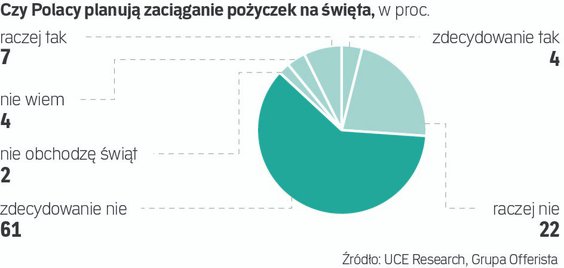 Inne badania dają podobne wyniki. W przeprowadzonym przez Maison & Partners dla ANG Odpowiedzialne Finanse, firmy pośrednictwa finansowo-ubezpieczeniowego, ponad 80 proc. Polaków zadeklarowało, że nigdy nie zapożyczało się na święta. Jedynie 12 proc. przyznało, że w tym roku lub w przeszłości korzystało z takiej opcji.