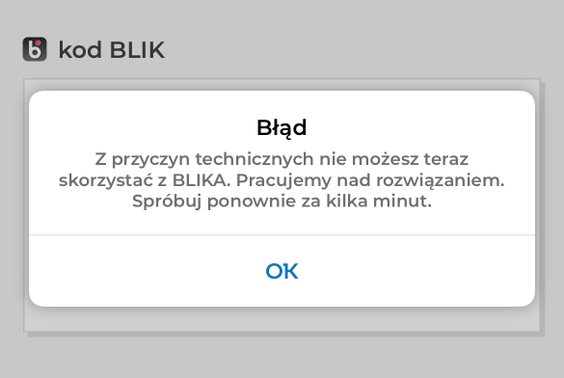 Klienci mBanku, którzy próbują skorzystać z płatności Blikiem dostają informację, że z przyczyn technicznych nie można skorzystać z tej formy płatności i trzeba spróbować za kilka minut.