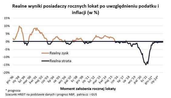 Na lokatach z najgorszym wynikiem mieliśmy do czynienia w październiku 2022 roku. Kończąca się wtedy przeciętna roczna lokata po uwzględnieniu naliczonych odsetek i inflacji dała aż 15 proc. realnej straty. Czyli po odebraniu pieniędzy z lokaty założonej na 10 tysięcy złotych mogliśmy za nasze oszczędności kupić po roku tyle, co za niecałe 8,5 tys. zł w dniu zakładania lokaty.