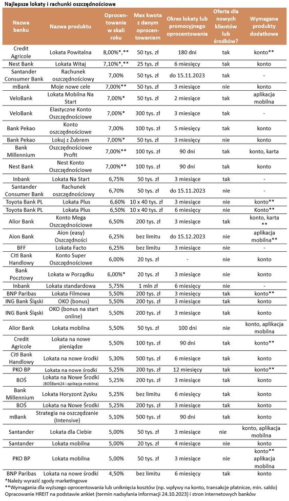 Na szczególne wyróżnienie zasługuje bank (Credit Agricole), który postanowił powitać nowych klientów lokatą na 8 proc. Niestety jak to zwykle bywa z czołówką najlepszych ofert depozytowych, trzeba spełnić kilka warunków, aby cieszyć się takim oprocentowaniem. Po pierwsze jest to oferta zarezerwowana dla nowych klientów, którzy na maksymalnie 180 dni mogą ulokować nie więcej niż 50 tysięcy złotych. Do tego trzeba jeszcze zgodzić się na kontakty marketingowe, logować się do aplikacji mobilnej i co miesiąc robić po 10 transakcji kartą lub BLIKiem.
