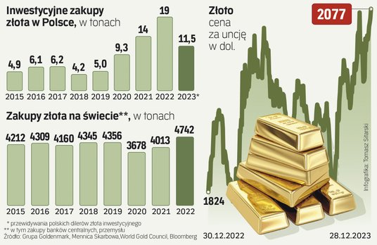 Wszyscy, którzy zainwestowali na początku tego roku w złoty kruszec w czwartek po świętach, gdy na światowych giełdach notowania złota przekroczyły 2077 dolarów za uncję, mogli się cieszyć prawie 14-proc. zwrotem z inwestycji. Jak jednak wynika z danych branżowej organizacji World Gold Council, w większości państw świata, w tym w Polsce, takich inwestorów było w 2023 r. wyraźnie mniej niż w ostatnich dwóch latach.