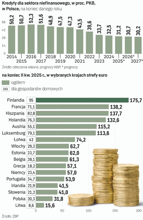 Z zestawienia przygotowanego przez Związek Banków Polskich w corocznym raporcie „InfoKredyt” wynika, że wśród krajów strefy euro Polska plasuje się pod tym względem na ostatnich pozycjach. Dla kredytów dla sektora niefinansowego ogółem to drugie miejsce od końca. Niższe wskaźniki osiąga jedynie Litwa – niecałe 16 proc. PKB, zaś na czele jest Finlandia – ponad 175 proc. PKB.