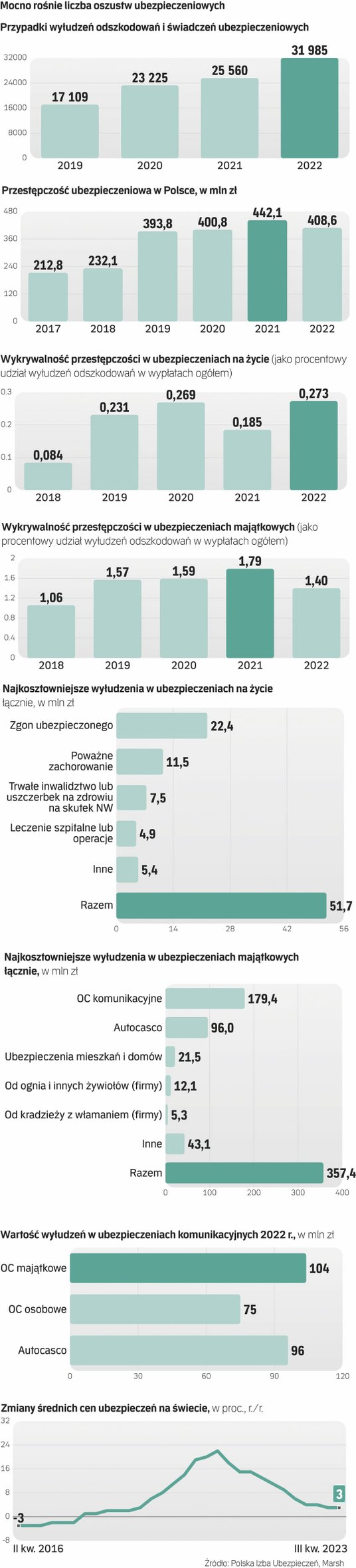 Polska Izba Ubezpieczeń podsumowała niedawno, jak problem ten wyglądał u nas w 2022 r. Okazuje się, że w tym czasie w Polsce wykryto 31 985 przypadków wyłudzeń odszkodowań i świadczeń. Ponad 8,6 tys. przypadków dotyczyło ubezpieczeń na życie, większość – bo ponad 23 tys. – ubezpieczeń majątkowych. Udaremniono nienależne wypłaty na kwotę 409 mln zł – 51,7 mln w ubezpieczeniach na życie oraz 357,3 mln zł w ubezpieczeniach majątkowych.