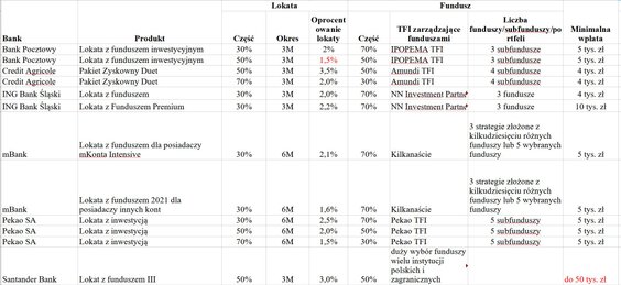 Oprocentowanie większości lokat z funduszami wynosi 2 proc. Do wyjątków należy oferta Credit Agricole w Pakiecie Zyskowny Duet, w którym połowa oszczędności zostaje na bankowym depozycie a połowa jest inwestowana. Oprocentowanie trzymiesięcznej lokaty wynosi 3,5 proc. Na 3 proc. można jeszcze liczyć w Santander Banku na Lokacie w promocji Lokata z funduszem III, na którą można wpłacić do 50 tys. zł. Z oferty można skorzystać do 30 czerwca.