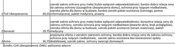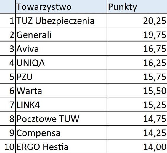 Ranking obejmuje ofertę towarzystw ubezpieczeniowych: Aviva, Compensy, ERGO Hestii, Generali, LINK4, Pocztowego TUW, PZU, TUZ Ubezpieczenia, UNIQA i Warty.