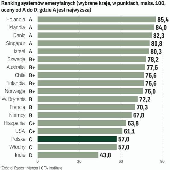 W raporcie Mercer i CFA Institute „Global Pension Index 2025” analizie i ocenie poddano 52 systemy emerytalne z różnych regionów świata. To już 17. edycja raportu. W opisanym w nim rankingu systemów emerytalnych do zdobycia było maksymalnie 100 pkt, a oceny przyznawano w skali od „A” do „D”, przy czym „A” można uznać za piątkę, zaś „D” za dwóję.